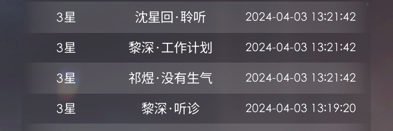 陪伴系统的黎深很邪门,每次我摸鱼的话最后结算的时候那些时间都会被莫名其妙扣掉,比如我设置15分钟,但是出去上了厕所或者和人聊天,等结束的时候就会显示类似:你们一起度过了10分钟35秒。这样的东西。但是鱼和星不会,会显示一起度过了15分0秒这种设置好的。然后一点半我又点开了陪伴系统拉满到半小时上限准备上班,但实际上开始发呆,现在两点不得不干活了,发现之前设置的时间也到了,准备再续半小时的时候,系统显示长时间未操作,把我踢出去重新登陆,再上线就不能续上之前的时长,下午的工作时间要从头计算。明明鱼和星都可以一口气续到3~4小时不会掉线的……