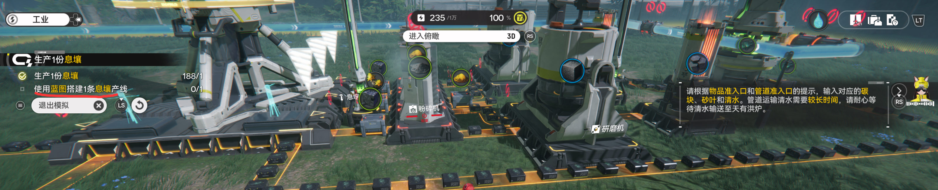 模拟空间-天有烘炉这个教程真的是能看出鹰角有多么弱智。照着教程走,后面还自己搭了个水管过去也没法完成,打开视频就看到UP主在骂这教程有点傻逼,已经超乎了人类对他的逻辑了。这个教程本来有一个水汞,你直接用前面建好的那个,搭新的水管不行,你必须自己搭一个新的水汞。你倒是说清楚啊?任务提示就只写“使用蓝图搭建一条息壤产线”,谁看得懂啊。