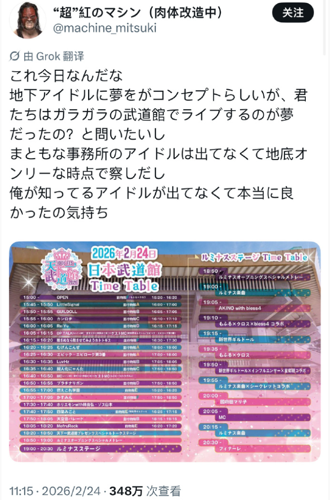 武道馆那个拼好馆,一个组合5分钟,器材调适要是出问题都不用唱歌了哈哈哈哈。